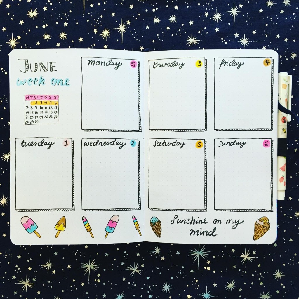 Onto the first weekly spread! This is pretty straightforward spread with 12 by 15 square boxes for each of the days spread across the double-page. I added a sort of striped drop shadow on each of the boxes to fit in with the main font I used, and there’s a bunch of ice lollies and ice creams along the bottom of the page, with a little quote.